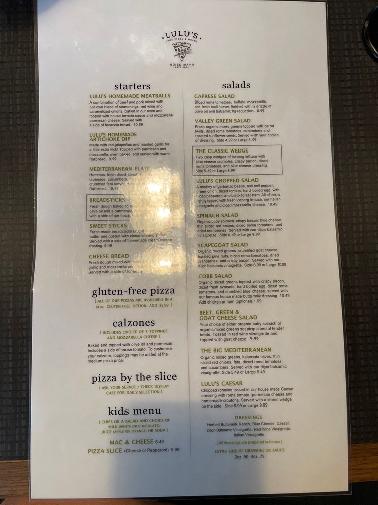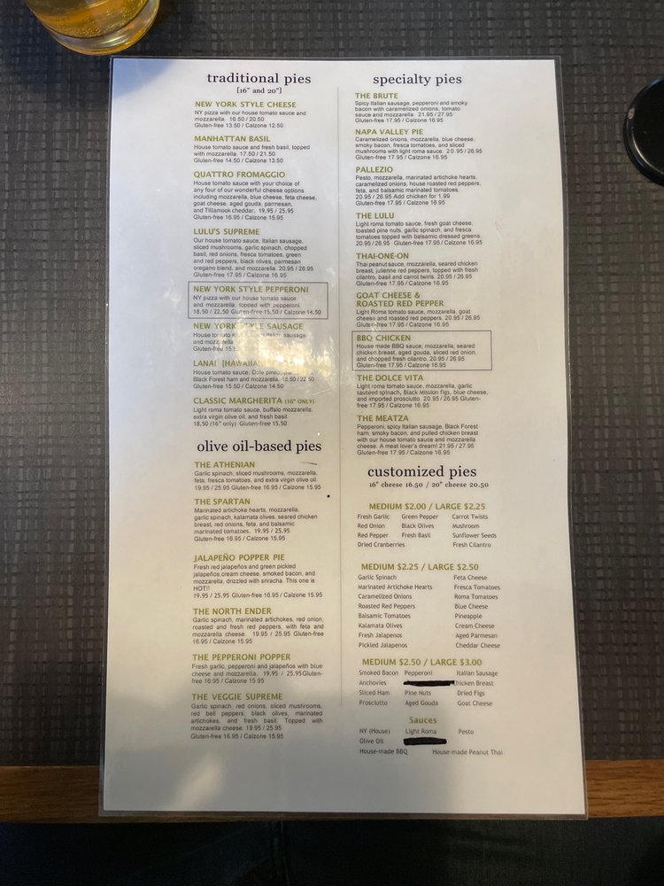 Lulu's Pizza Menu